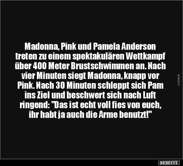 Madonna, Pink und Pamela Anderson treten zu einem spektakulären Wettkampf über 400 Meter Brustschwimmen an. Nach vier Minuten siegt Madonna, knapp vor Pink. Nach 30 Minuten schleppt sich Pam ins Ziel und beschwert sich nach Luft ringend: "Das ist echt voll fies von euch, ihr habt ja auch die Arme benutzt!"