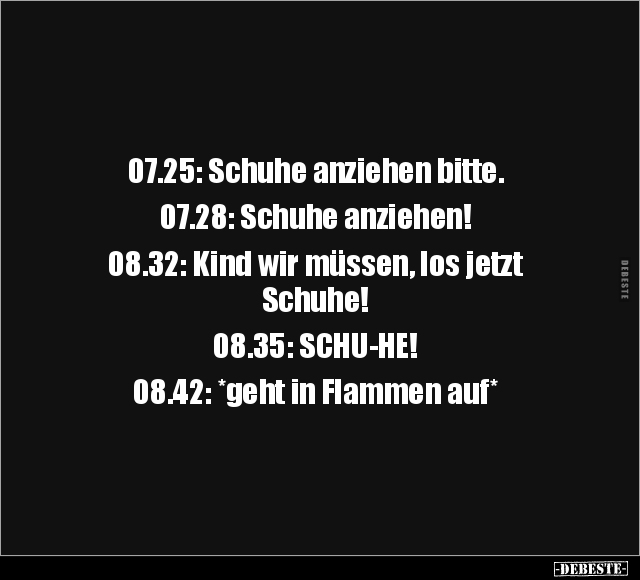07.25: Schuhe anziehen bitte. 07.28: Schuhe anziehen! 08.32: Kind wir müssen, los jetzt Schuhe! 08.35: SCHU-HE! 08.42: *geht in Flammen auf*