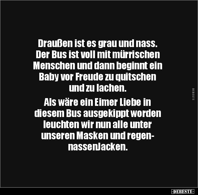 Draußen ist es grau und nass. Der Bus ist voll mit mürrischen Menschen und dann beginnt ein Baby vor Freude zu quitschen und zu lachen. Als wäre ein Eimer Liebe in diesem Bus ausgekippt worden leuchten wir nun alle unter unseren Masken und regen- nassenJacken.