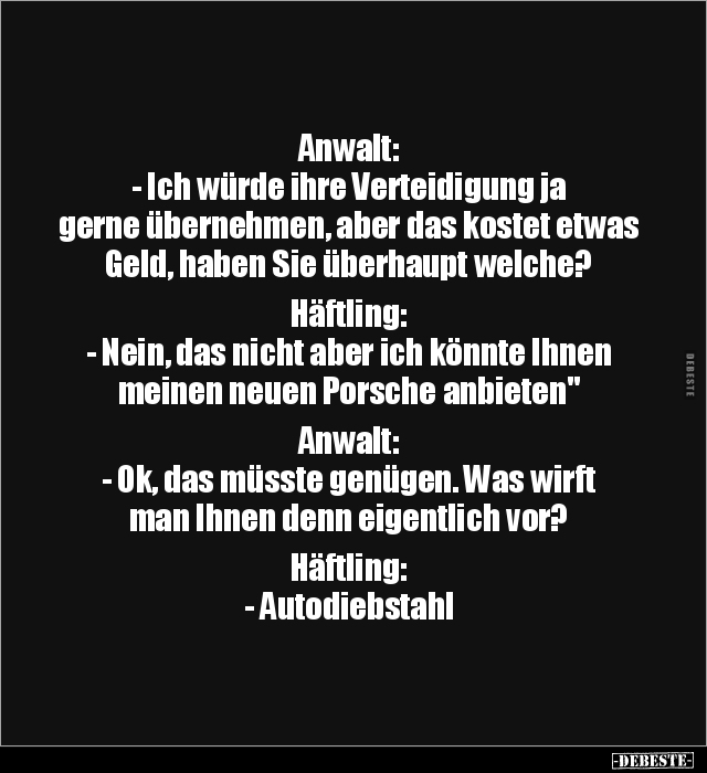 Anwalt: - Ich würde ihre Verteidigung ja gerne übernehmen, aber das kostet etwas Geld, haben Sie überhaupt welche? Häftling: - Nein, das nicht aber ich könnte Ihnen meinen neuen Porsche anbieten" Anwalt: - Ok, das müsste genügen. Was wirft man Ihnen denn eigentlich vor? Häftling: - Autodiebstahl