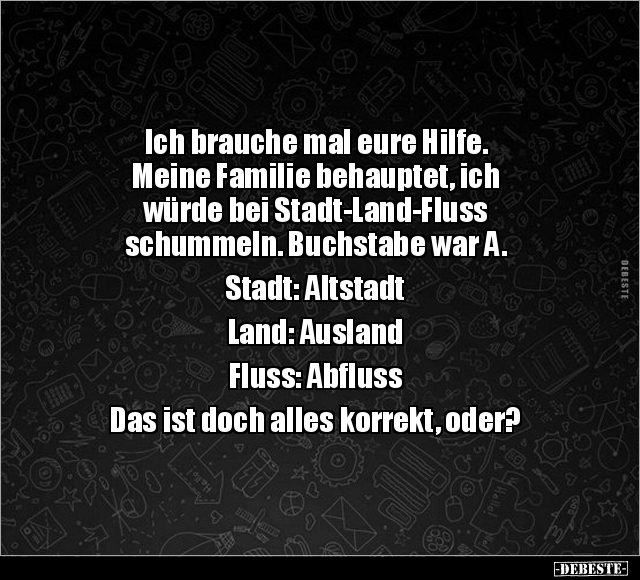 Ich brauche mal eure Hilfe. Meine Familie behauptet, ich würde bei Stadt-Land-Fluss schummeln. Buchstabe war A. Stadt: Altstadt Land: Ausland Fluss: Abfluss Das ist doch alles korrekt, oder?