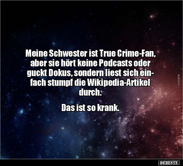 Meine Schwester ist True Crime-Fan, aber sie hört keine Podcasts oder guckt Dokus, sondern liest sich ein- fach stumpf die Wikipedia-Artikel durch. Das ist so krank.