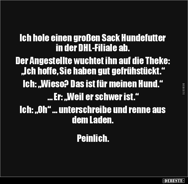 Ich hole einen großen Sack Hundefutter in der DHL-Filiale ab. Der Angestellte wuchtet ihn auf die Theke: „Ich hoffe, Sie haben gut gefrühstückt.“ Ich: „Wieso? Das ist für meinen Hund.“ … Er: „Weil er schwer ist.“ Ich: „Oh“ … unterschreibe und renne aus dem Laden. Peinlich.