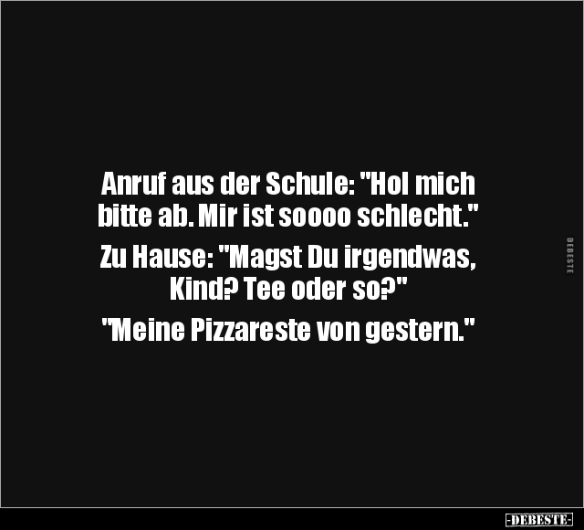 Anruf aus der Schule: "Hol mich bitte ab. Mir ist soooo schlecht." Zu Hause: "Magst Du irgendwas, Kind? Tee oder so?" "Meine Pizzareste von gestern."