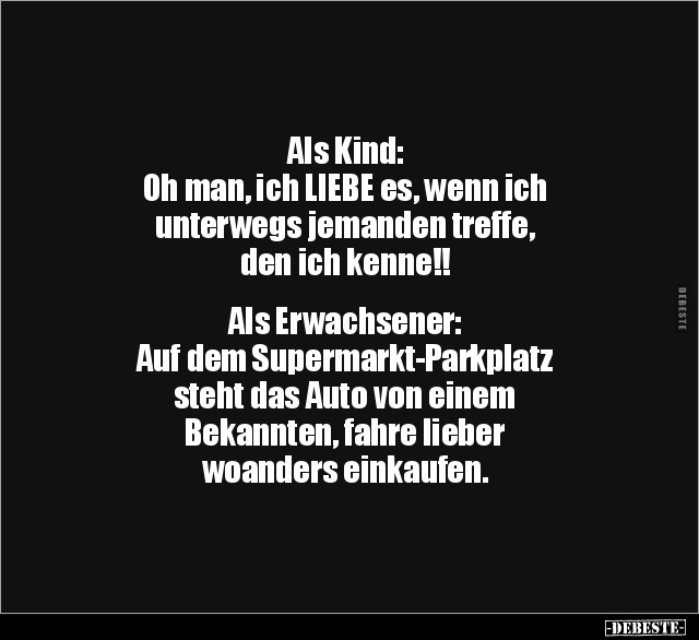 Als Kind: Oh man, ich LIEBE es, wenn ich unterwegs jemanden treffe, den ich kenne!! Als Erwachsener: Auf dem Supermarkt-Parkplatz steht das Auto von einem Bekannten, fahre lieber woanders einkaufen.