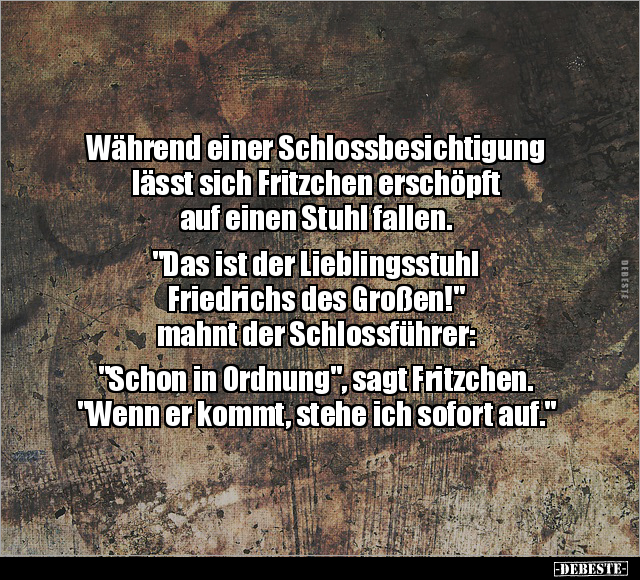 Während einer Schlossbesichtigung lässt sich Fritzchen erschöpft auf einen Stuhl fallen. "Das ist der Lieblingsstuhl Friedrichs des Großen!" mahnt der Schlossführer: "Schon in Ordnung", sagt Fritzchen. "Wenn er kommt, stehe ich sofort auf."