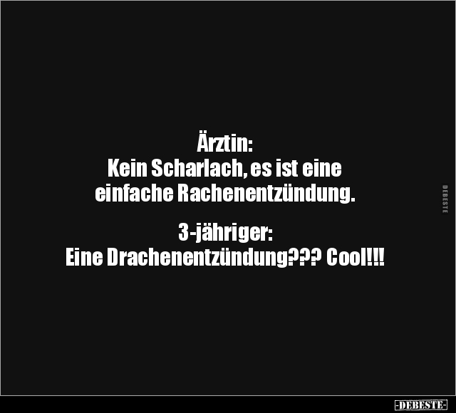Ärztin: Kein Scharlach, es ist eine einfache Rachenentzündung. 3-jähriger: Eine Drachenentzündung??? Cool!!!