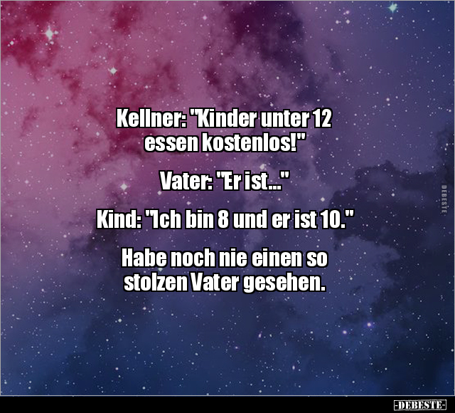 Kellner: "Kinder unter 12 essen kostenlos!" Vater: "Er ist..." Kind: "Ich bin 8 und er ist 10." Habe noch nie einen so stolzen Vater gesehen.
