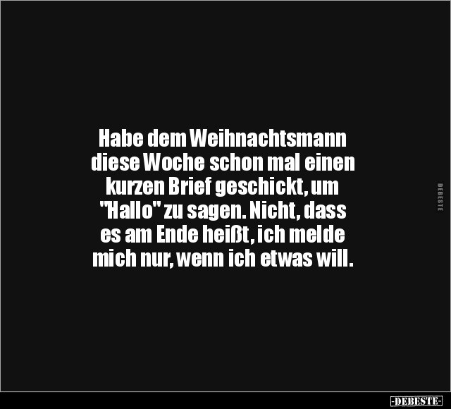 Habe dem Weihnachtsmann diese Woche schon mal einen kurzen Brief geschickt, um "Hallo" zu sagen. Nicht, dass es am Ende heißt, ich melde mich nur, wenn ich etwas will.