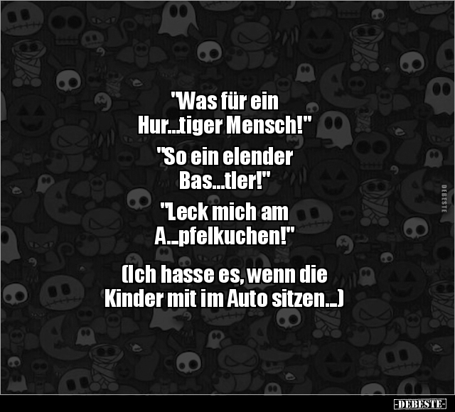 "Was für ein Hur...tiger Mensch!" "So ein elender Bas...tler!" "Leck mich am A...pfelkuchen!" (Ich hasse es, wenn die Kinder mit im Auto sitzen...)