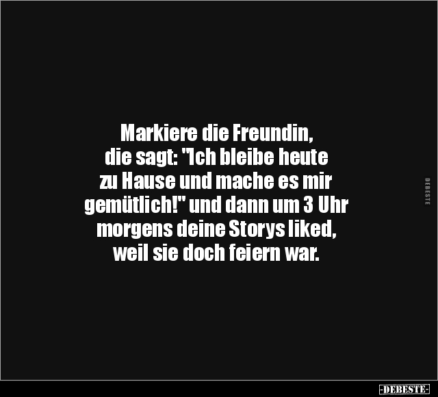 Markiere die Freundin, die sagt: "Ich bleibe heute zu Hause und mache es mir gemütlich!" und dann um 3 Uhr morgens deine Storys liked, weil sie doch feiern war.