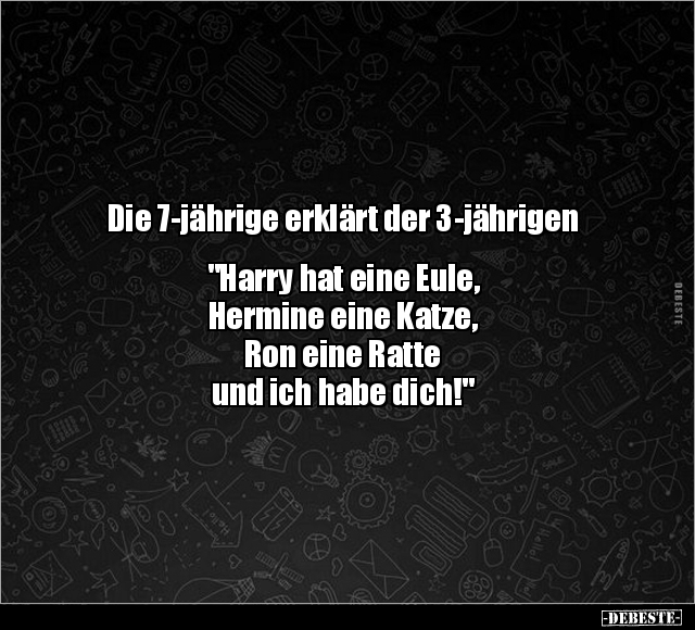Die 7-jährige erklärt der 3-jährigen "Harry hat eine Eule, Hermine eine Katze, Ron eine Ratte und ich habe dich!"