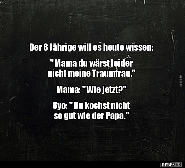 Der 8 Jährige will es heute wissen: " Mama du wärst leider nicht meine Traumfrau." Mama: " Wie jetzt?" 8yo: " Du kochst nicht so gut wie der Papa."