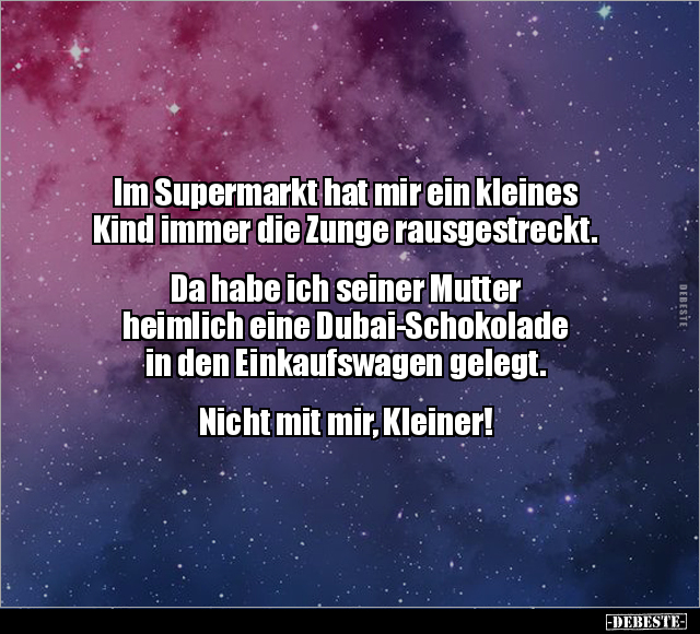 Im Supermarkt hat mir ein kleines Kind immer die Zunge rausgestreckt. Da habe ich seiner Mutter heimlich eine Dubai-Schokolade in den Einkaufswagen gelegt. Nicht mit mir, Kleiner!