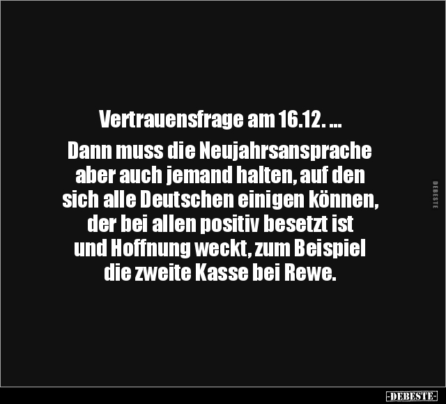 Vertrauensfrage am 16.12. … Dann muss die Neujahrsansprache aber auch jemand halten, auf den sich alle Deutschen einigen können, der bei allen positiv besetzt ist und Hoffnung weckt, zum Beispiel die zweite Kasse bei Rewe.