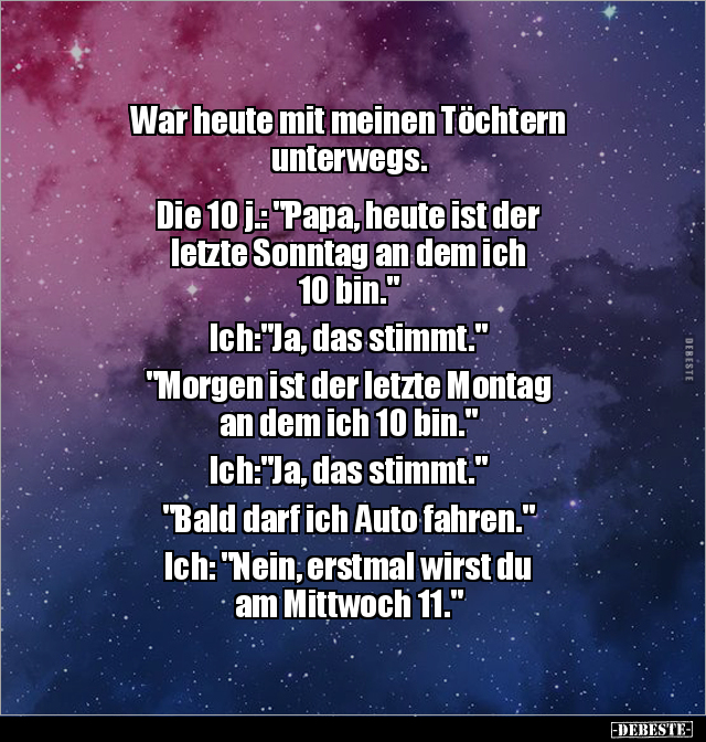 War heute mit meinen Töchtern unterwegs. Die 10 j.: "Papa, heute ist der letzte Sonntag an dem ich 10 bin." Ich:"Ja, das stimmt." "Morgen ist der letzte Montag an dem ich 10 bin." Ich:"Ja, das stimmt." "Bald darf ich Auto fahren." Ich: "Nein, erstmal wirst du am Mittwoch 11."