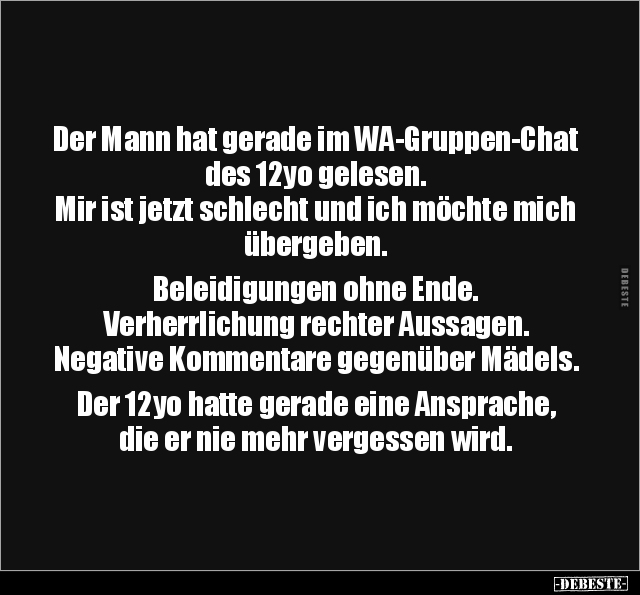 Der Mann hat gerade im WA-Gruppen-Chat des 12yo gelesen. Mir ist jetzt schlecht und ich möchte mich übergeben. Beleidigungen ohne Ende. Verherrlichung rechter Aussagen. Negative Kommentare gegenüber Mädels. Der 12yo hatte gerade eine Ansprache, die er nie mehr vergessen wird.