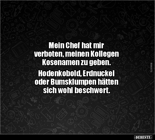 Mein Chef hat mir verboten, meinen Kollegen Kosenamen zu geben. Hodenkobold, Erdnuckel oder Bumsklumpen hätten sich wohl beschwert.