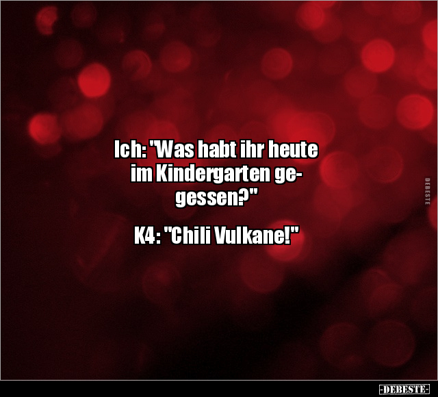 Ich: "Was habt ihr heute im Kindergarten ge- gessen?" K4: "Chili Vulkane!"