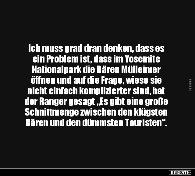 Ich muss grad dran denken, dass es ein Problem ist, dass im Yosemite Nationalpark die Bären Mülleimer öffnen und auf die Frage, wieso sie nicht einfach komplizierter sind, hat der Ranger gesagt „Es gibt eine große Schnittmenge zwischen den klügsten Bären und den dümmsten Touristen“.