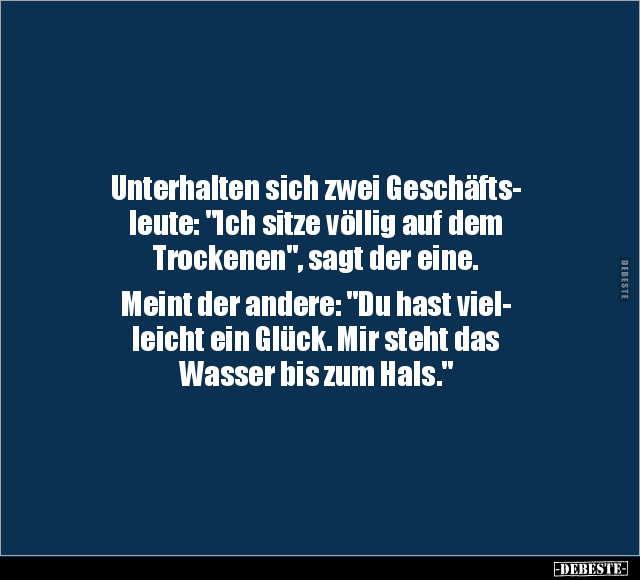 Unterhalten sich zwei Geschäfts- leute: "Ich sitze völlig auf dem Trockenen", sagt der eine. Meint der andere: "Du hast viel- leicht ein Glück. Mir steht das Wasser bis zum Hals."