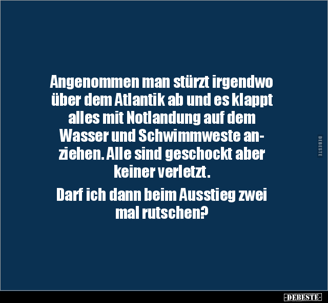 Angenommen man stürzt irgendwo über dem Atlantik ab und es klappt alles mit Notlandung auf dem Wasser und Schwimmweste an- ziehen. Alle sind geschockt aber keiner verletzt. Darf ich dann beim Ausstieg zwei mal rutschen?