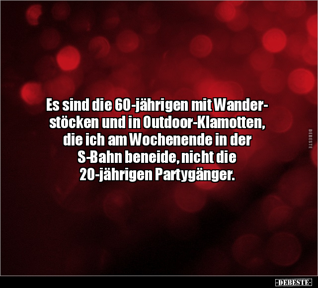 Es sind die 60-jährigen mit Wander- stöcken und in Outdoor-Klamotten, die ich am Wochenende in der S-Bahn beneide, nicht die 20-jährigen Partygänger.