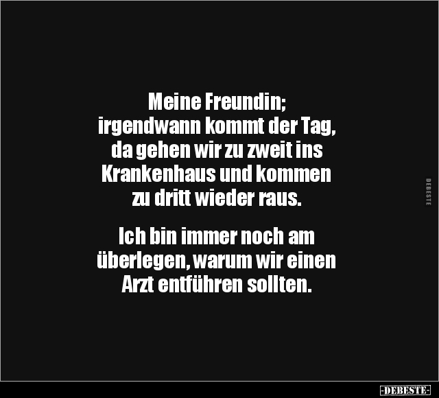 Meine Freundin; irgendwann kommt der Tag, da gehen wir zu zweit ins Krankenhaus und kommen zu dritt wieder raus. Ich bin immer noch am überlegen, warum wir einen Arzt entführen sollten.