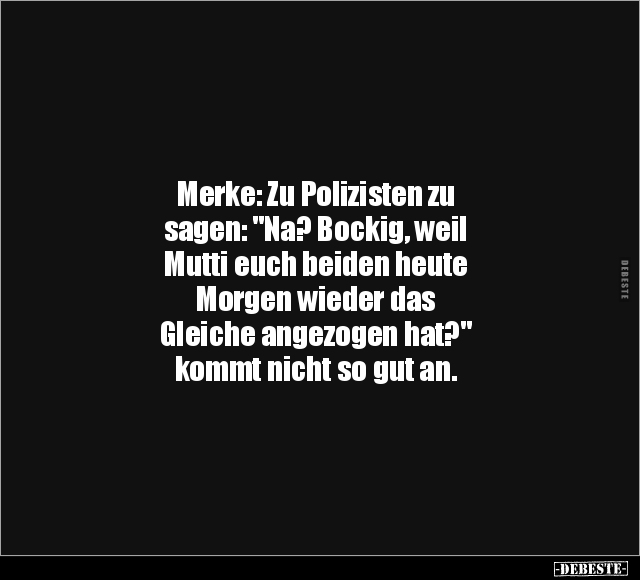 Merke: Zu Polizisten zu sagen: "Na? Bockig, weil Mutti euch beiden heute Morgen wieder das Gleiche angezogen hat?" kommt nicht so gut an.