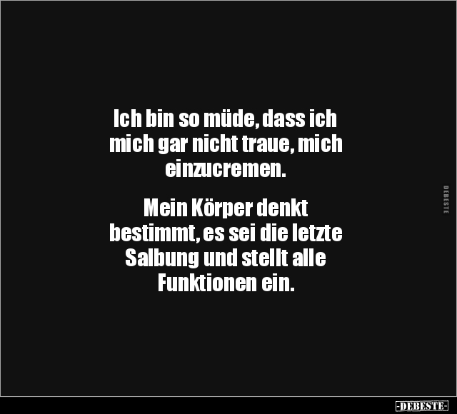 Ich bin so müde, dass ich mich gar nicht traue, mich einzucremen. Mein Körper denkt bestimmt, es sei die letzte Salbung und stellt alle Funktionen ein.