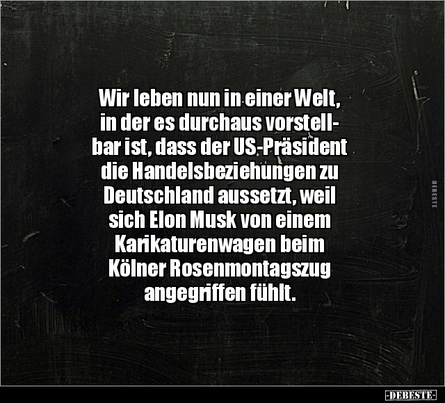 Wir leben nun in einer Welt, in der es durchaus vorstell- bar ist, dass der US-Präsident die Handelsbeziehungen zu Deutschland aussetzt, weil sich Elon Musk von einem Karikaturenwagen beim Kölner Rosenmontagszug angegriffen fühlt.