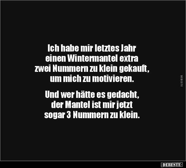 Ich habe mir letztes Jahr einen Wintermantel extra zwei Nummern zu klein gekauft, um mich zu motivieren. Und wer hätte es gedacht, der Mantel ist mir jetzt sogar 3 Nummern zu klein.