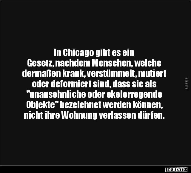 In Chicago gibt es ein Gesetz, nachdem Menschen, welche dermaßen krank, verstümmelt, mutiert oder deformiert sind, dass sie als "unansehnliche oder ekelerregende Objekte" bezeichnet werden können, nicht ihre Wohnung verlassen dürfen.