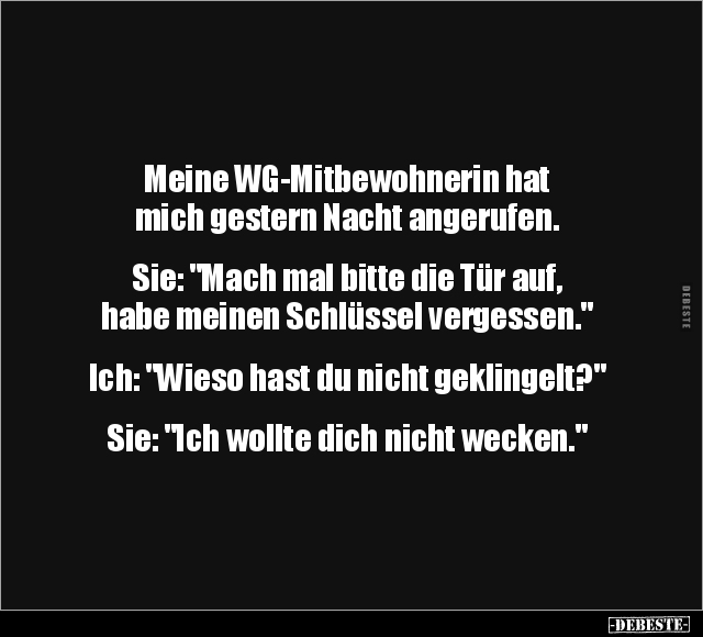 Meine WG-Mitbewohnerin hat mich gestern Nacht angerufen. Sie: "Mach mal bitte die Tür auf, habe meinen Schlüssel vergessen." Ich: "Wieso hast du nicht geklingelt?" Sie: "Ich wollte dich nicht wecken."