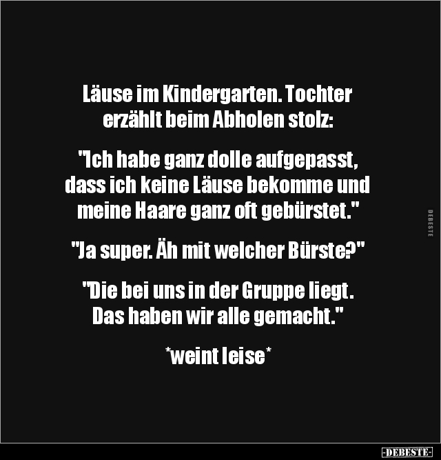 Läuse im Kindergarten. Tochter erzählt beim Abholen stolz: "Ich habe ganz dolle aufgepasst, dass ich keine Läuse bekomme und meine Haare ganz oft gebürstet." "Ja super. Äh mit welcher Bürste?" "Die bei uns in der Gruppe liegt. Das haben wir alle gemacht." *weint leise*