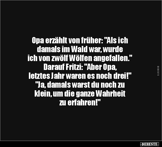 Opa erzählt von früher: "Als ich damals im Wald war, wurde ich von zwölf Wölfen angefallen." Darauf Fritzi: "Aber Opa, letztes Jahr waren es noch drei!" "Ja, damals warst du noch zu klein, um die ganze Wahrheit zu erfahren!"