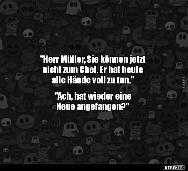 "Herr Müller, Sie können jetzt nicht zum Chef. Er hat heute alle Hände voll zu tun." "Ach, hat wieder eine Neue angefangen?"