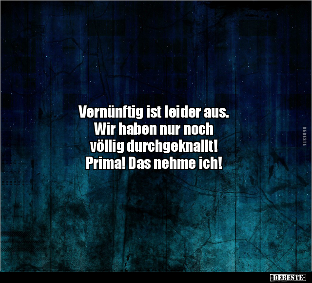 Vernünftig ist leider aus. Wir haben nur noch völlig durchgeknallt! Prima! Das nehme ich!