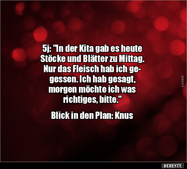 5j: "In der Kita gab es heute Stöcke und Blätter zu Mittag. Nur das Fleisch hab ich ge- gessen. Ich hab gesagt, morgen möchte ich was richtiges, bitte." Blick in den Plan: Knus