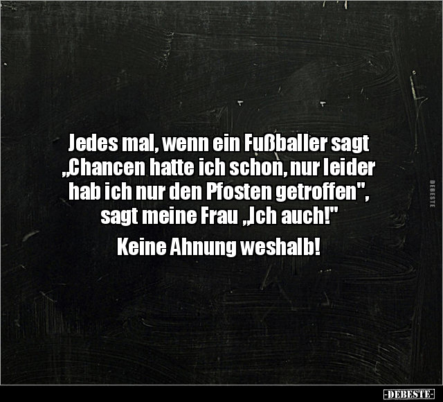 Jedes mal, wenn ein Fußballer sagt „Chancen hatte ich schon, nur leider hab ich nur den Pfosten getroffen", sagt meine Frau „Ich auch!" Keine Ahnung weshalb!