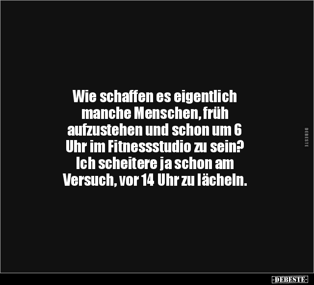 Wie schaffen es eigentlich manche Menschen, früh aufzustehen und schon um 6 Uhr im Fitnessstudio zu sein? Ich scheitere ja schon am Versuch, vor 14 Uhr zu lächeln.