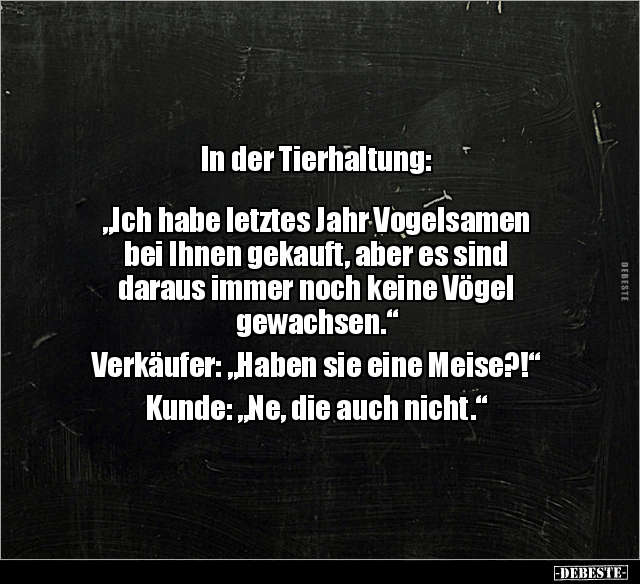 In der Tierhaltung: „Ich habe letztes Jahr Vogelsamen bei Ihnen gekauft, aber es sind daraus immer noch keine Vögel gewachsen.“ Verkäufer: „Haben sie eine Meise?!“ Kunde: „Ne, die auch nicht.“