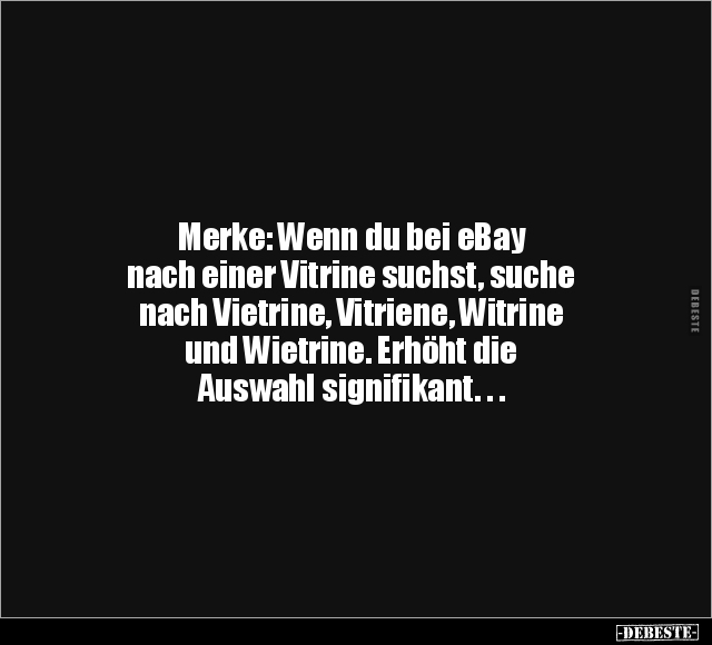 Merke: Wenn du bei eBay nach einer Vitrine suchst, suche nach Vietrine, Vitriene, Witrine und Wietrine. Erhöht die Auswahl signifikant. . .