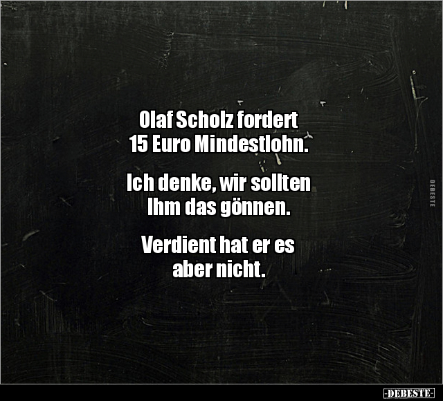 Olaf Scholz fordert 15 Euro Mindestlohn. Ich denke, wir sollten Ihm das gönnen. Verdient hat er es aber nicht.
