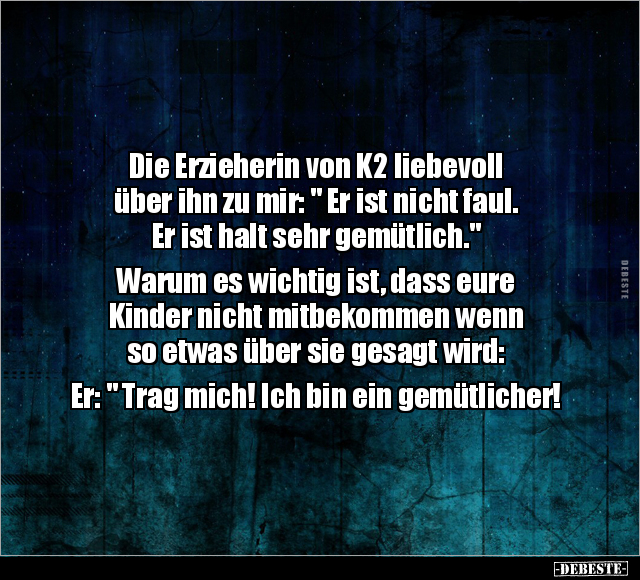 Die Erzieherin von K2 liebevoll über ihn zu mir: " Er ist nicht faul. Er ist halt sehr gemütlich." Warum es wichtig ist, dass eure Kinder nicht mitbekommen wenn so etwas über sie gesagt wird: Er: " Trag mich! Ich bin ein gemütlicher!