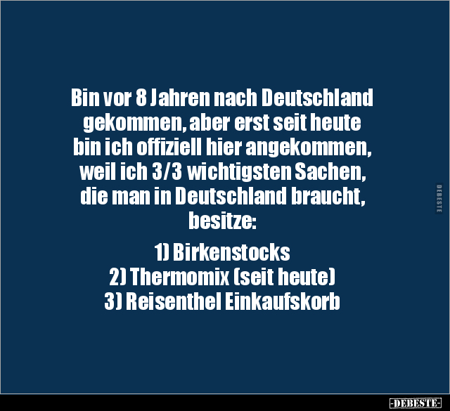 Bin vor 8 Jahren nach Deutschland gekommen, aber erst seit heute bin ich offiziell hier angekommen, weil ich 3/3 wichtigsten Sachen, die man in Deutschland braucht, besitze: 1) Birkenstocks 2) Thermomix (seit heute) 3) Reisenthel Einkaufskorb