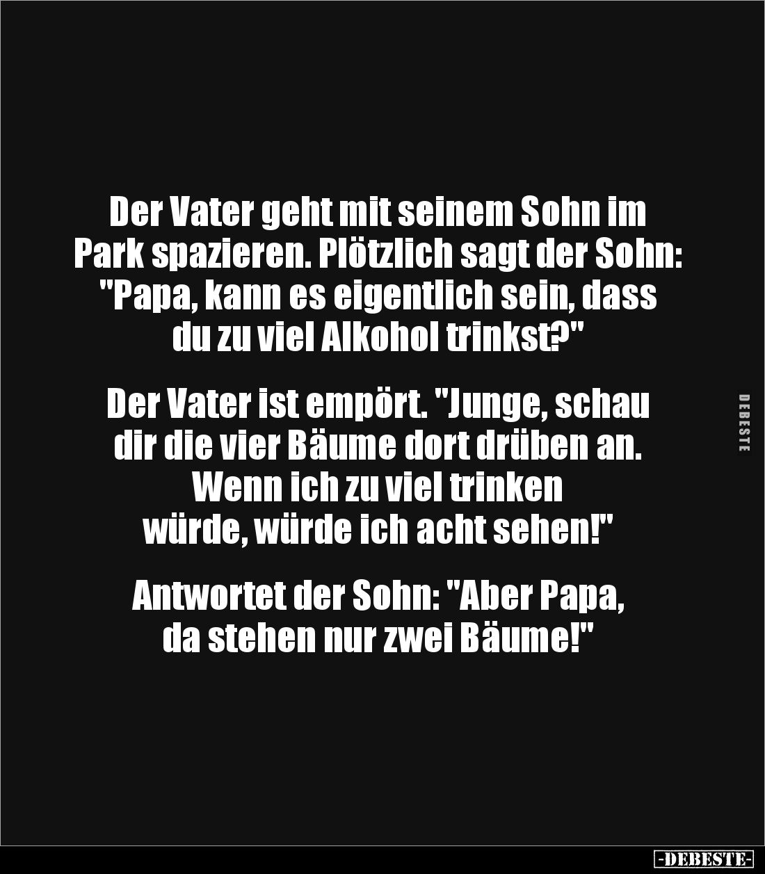 Der Vater geht mit seinem Sohn im Park spazieren. Plötzlich sagt der Sohn: "Papa, kann es eigentlich sein, dass du zu viel Alkohol trinkst?" Der Vater ist empört. "Junge, schau dir die vier Bäume dort drüben an. Wenn ich zu viel trinken würde, würde ich acht sehen!" Antwortet der Sohn: "Aber Papa, da stehen nur zwei Bäume!"