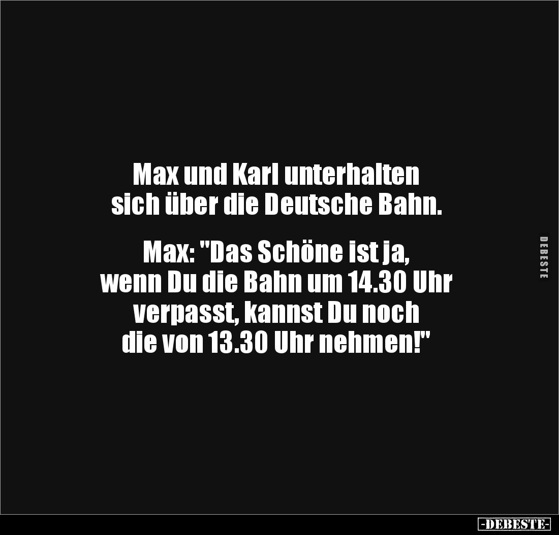 Max und Karl unterhalten sich über die Deutsche Bahn. Max: "Das Schöne ist ja, wenn Du die Bahn um 14.30 Uhr verpasst, kannst Du noch die von 13.30 Uhr nehmen!"