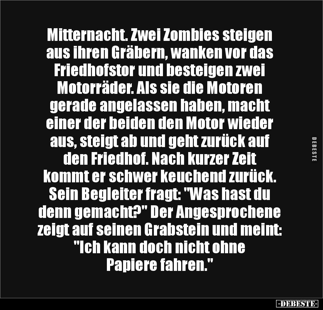Mitternacht. Zwei Zombies steigen aus ihren Gräbern, wanken vor das Friedhofstor und besteigen zwei Motorräder. Als sie die Motoren gerade angelassen haben, macht einer der beiden den Motor wieder aus, steigt ab und geht zurück auf den Friedhof. Nach kurzer Zeit kommt er schwer keuchend zurück. Sein Begleiter fragt: "Was hast du denn gemacht?" Der Angesprochene zeigt auf seinen Grabstein und meint: "Ich kann doch nicht ohne Papiere fahren."