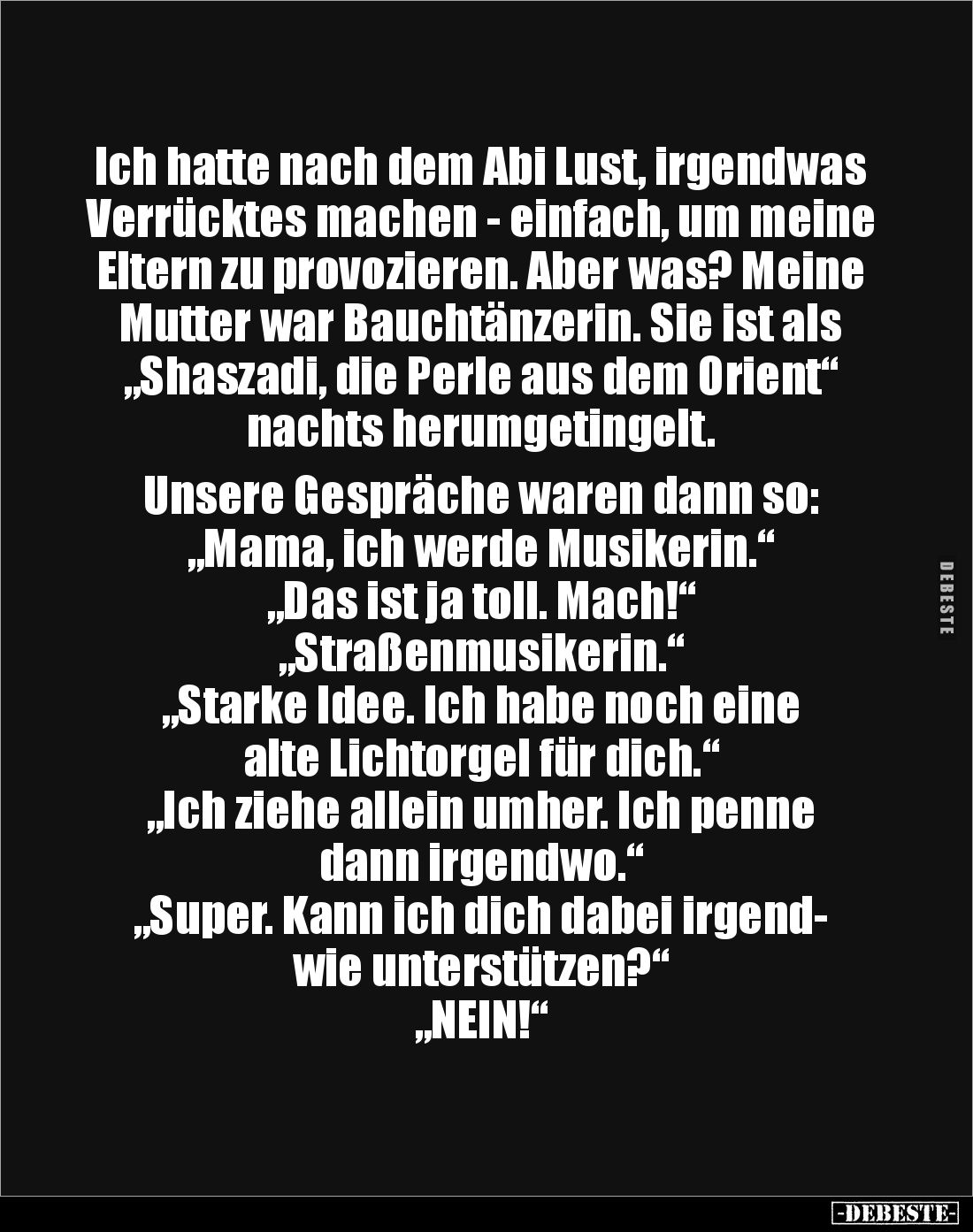 Ich hatte nach dem Abi Lust, irgendwas Verrücktes machen - einfach, um meine Eltern zu provozieren. Aber was? Meine Mutter war Bauchtänzerin. Sie ist als „Shaszadi, die Perle aus dem Orient“ nachts herumgetingelt. Unsere Gespräche waren dann so: „Mama, ich werde Musikerin.“ „Das ist ja toll. Mach!“ „Straßenmusikerin.“ „Starke Idee. Ich habe noch eine alte Lichtorgel für dich.“ „Ich ziehe allein umher. Ich penne dann irgendwo.“ „Super. Kann ich dich dabei irgend- wie unterstützen?“ „NEIN!“